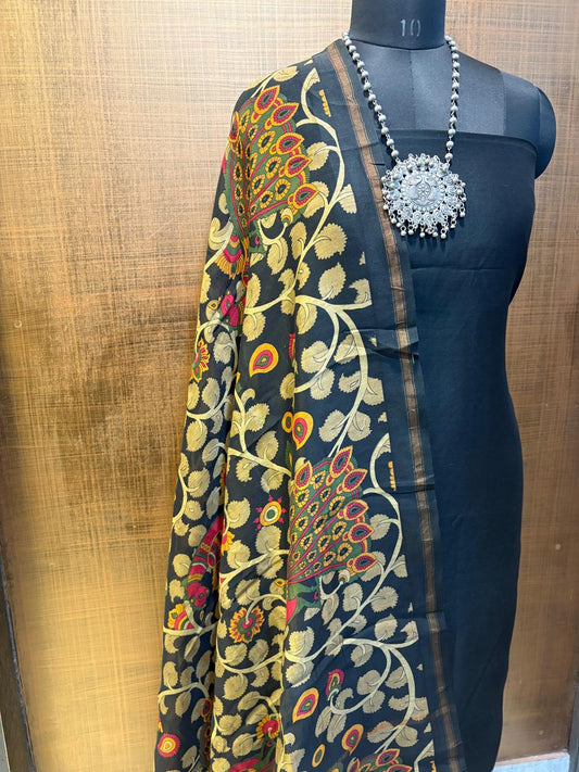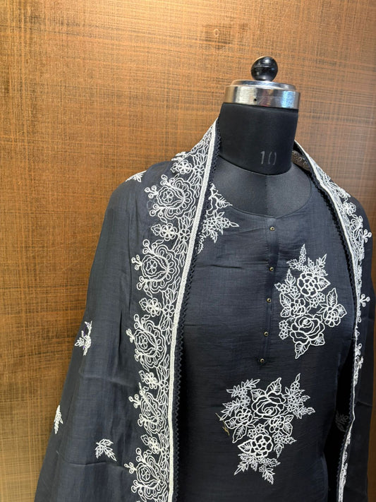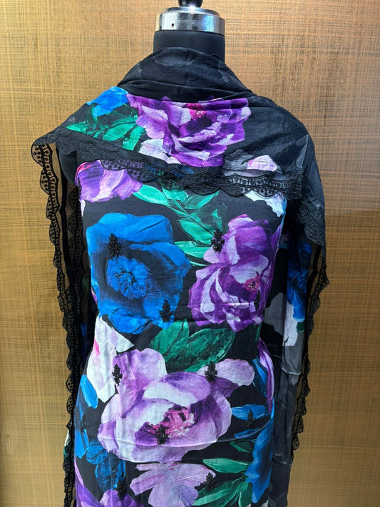 Black Muslin Floral Print Suit with Chiffon Dupatta Organza work