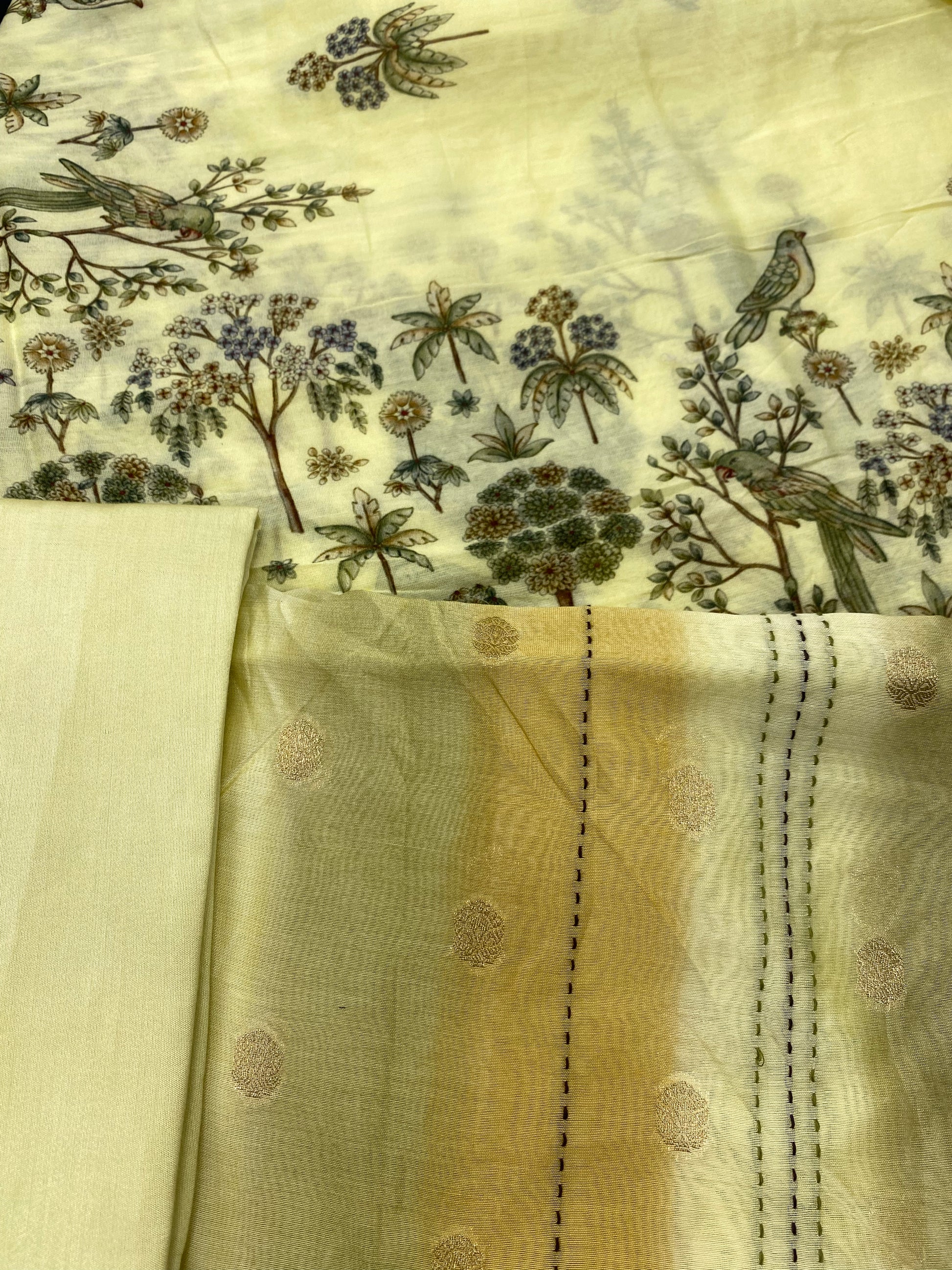 This Lime Yellow Maheshwari suit boasts a stunning Banarasi Booti design and is made from high-quality mul chanderi fabric. Its vibrant digital print adds an artistic touch to the overall look. The perfect blend of tradition and modernity, this suit is a must-have for any wardrobe.
